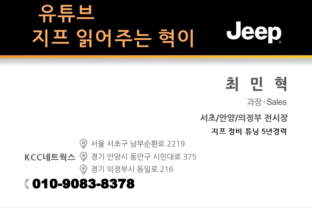 안녕하세요 지프 읽어주는 혁이 지프 KCC 의정부/서초/안양 지프 정비튜닝 5년, 현 지프 공식 딜러 8년 경력의 최민혁 과장입니다. 새해가 밝은지 엊그제 같은데 벌써 1월도 막바지를 향해 달려가